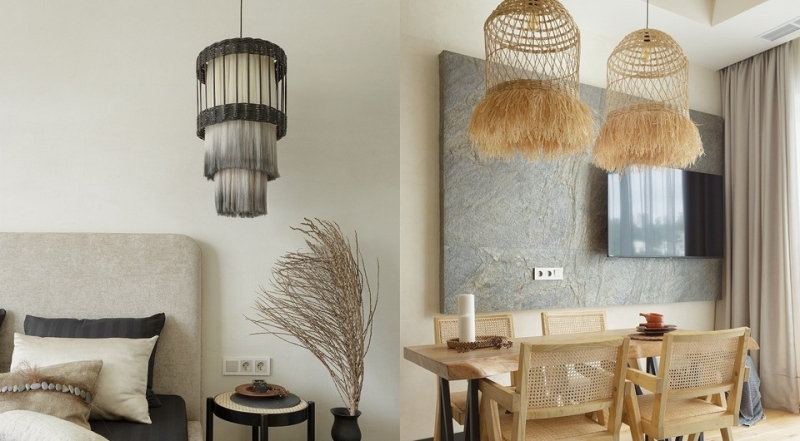 Очень важная роль текстильному оформлению была отведена в спальнях. Чтобы создать южный колорит и уютную атмосферу, в декоре использованы натуральные природные материалы, которые на юге встречаются буквально на каждом шагу. Например, большая декоративная подушка декорирована морской галькой и коричнево-бурыми волокнами от ствола пальмы трахикарпус, а ее наполнение из полезных трав, произрастающих на побережье. Покрывало и подушки выполнены вручную текстильными дизайнерами. Дополняют всю композицию подвесные светильники из бумажной лозы с бахромой, окрашенной градиентом в черный цвет. Светильники ручной работы в столовой из авторской коллекции дизайнера Олеси Пашьян дают мягкий теплый свет и создают причудливую игру теней благодаря хлопковым нитям.