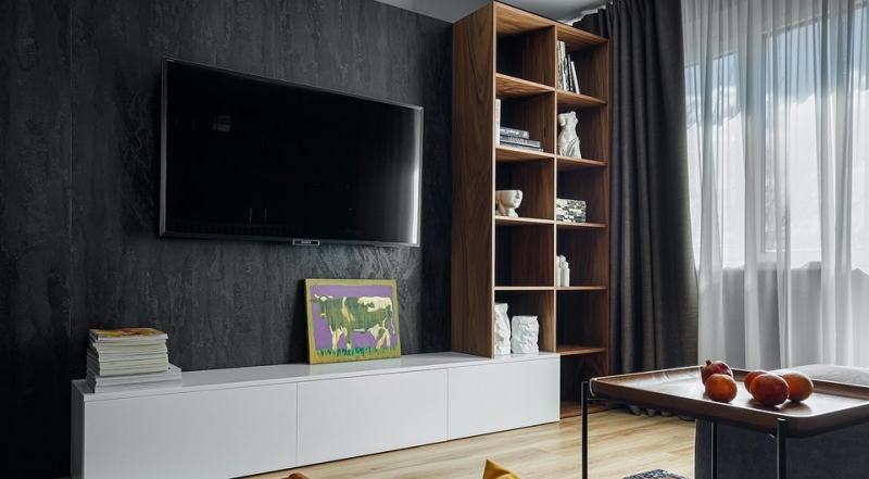 Планируя размещение стенки, помните про эргономику: все шкафчики должны свободно открываться (заложите хотя бы по 50-60 см перед каждой дверцей), а к полкам обеспечен свободный подход. Также убедитесь, что в этой зоне есть все необходимые розетки (для телевизора, проигрывателя, увлажнителя воздуха, робота-пылесоса и т.д.) и они находятся в быстром доступе.