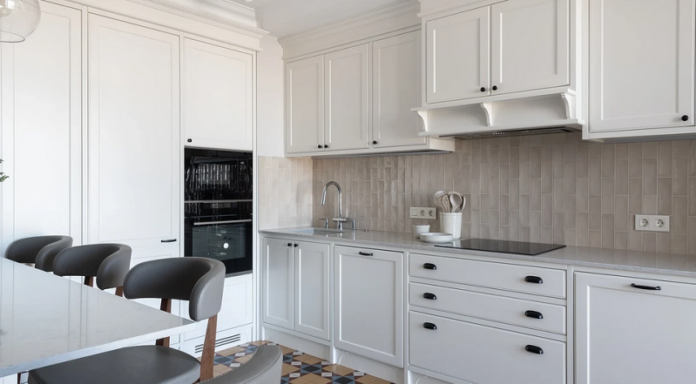 Самое важное подобрать правильный оттенок. Холодный подтон белого подойдет, если окна выходят на солнечную сторону так зона готовки будет казаться прохладнее и не возникнет ощущения больничной стерильности. А вот если естественного света на кухне мало, подбирайте для мебели и отделки более теплые вариации: пудровый, шампань, слоновую кость и т.д.