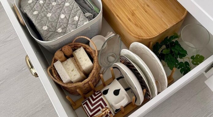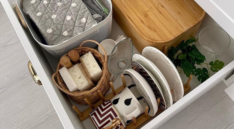 Обычно, если ящик не оборудован сушкой для тарелок, посуда хранится там стопками. Это удобно для плоских тарелок, поскольку экономит место. Но если проделать все то же самое с глубокими емкостями, получится уже не так компактно. Гораздо удобнее организовать их с помощью специальных держателей, чтобы тарелки стояли вертикально. Так проще будет достать каждый предмет, а пространство внутри ящика распределится более рационально.