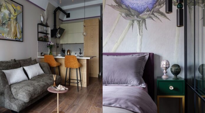«Мы хотели создать эффект цветочной поляны, комментирует Екатерина. Цветовая палитра этого интерьера состоит из необычных насыщенных цветов: розово-фиолетового, зеленого, желтого, песочного и оранжевого. Бросается в глаза цвет аметиста сиренево-розовый, а приятный бежево-серый цвет служит базой. Им покрашены коридор и кухня-гостиная. Аметист мы использовали в спальне, чтобы добавить его к акцентным фрескам с изображениями гигантских артишоков. Чуть-чуть этого цвета есть на самих цветах. Гигантские цветы выбраны не случайно для небольшого пространства. Они создают необходимый контраст, уют и как будто увеличивают спальню. Аметистовая полоса идет по периметру всего апартамента, где основной цвет стен бежево-серый. Апартамент вытянутый и небольшой. Этот декоративный прием визуально уменьшает высоту потолка, делая его пропорции сомасштабнее человеку».
