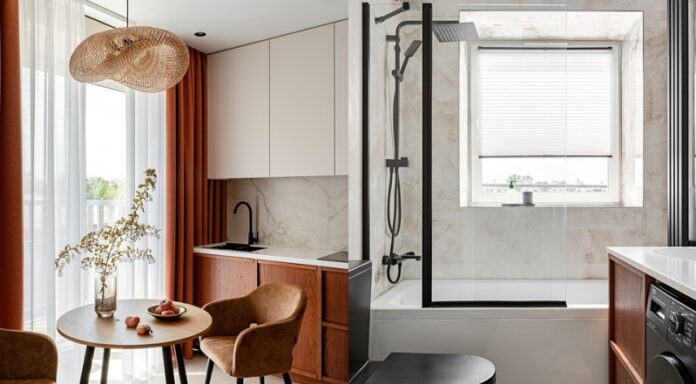 Заказчице нравится стиль джапанди, для которого характерно детальное продумывание разнообразных систем хранения. Эта квартира-студия пример такого подхода к организации пространства. Лаконичная кухонная мебель со встроенной бытовой техникой обладает достаточным функционалом для запасов продуктов и приготовления пищи. В высоком шкафу в прихожей есть отделение для хозяйственных предметов. Дополнительные места для вещей в комодной части под ТВ-зоной. Из двух колористических концепций хозяйка квартиры выбрала более яркую. Так, мебель с отделкой из тонированного шпона дуба и портьеры терракотового цвета стали акцентными на фоне нейтральных стен, а соломенная люстра над столом добавила балийского настроения.