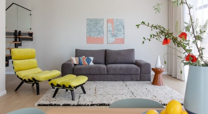 Как и говорилось выше, именно за счет выбора мебели дизайнер хотела добавить «ярких пятен», сошедших с полотен хозяйки дома. Так в интерьере появилось кресло в салатовой обивке. В детских голубые фасады шкафов. В картине интерьера яркими «мазками» проходит так же текстиль и декор искусство и постеры на стенах.