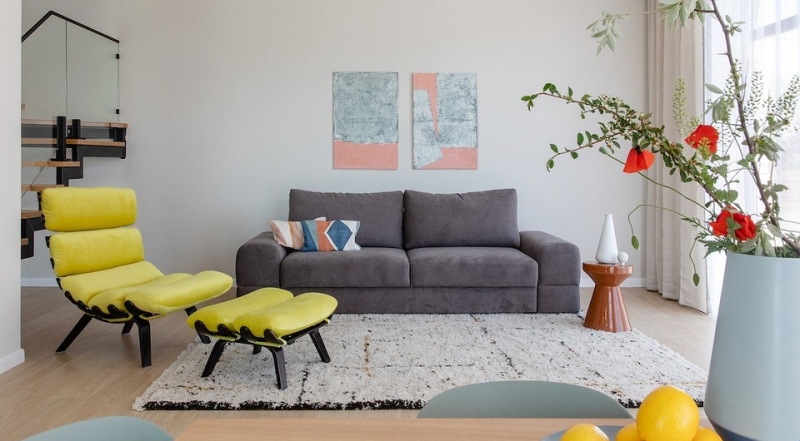 На создание интерьера Ксению вдохновили работы хозяйки. Она использует сочные и яркие краски. Но в проекте Ксения решила отдать роль акцентов мебели. «Фон» же стал нейтральным. На стенах краска. На полу во всех помещениях, за исключением санузла и входной зоны ламинат. В санузлах использовали плитку и керамогранит, но ничего излишне яркого базовые материалы в натуральных цветах и фактурах. Двери белого цвета, без филенок. Все соответствует современному стилю, намека на классику нет.