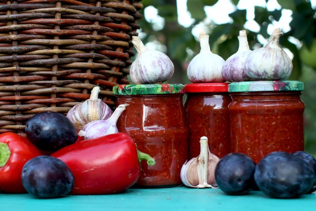 Вам понадобятся: 1 кг слив, 1 перец чили, 1 головка чеснока, 2 ст.л. сахара, 1,5 ст.л. соли, 2 ч.л. хмели-сунели, 1 ч.л. сушеной мяты, большой пучок кинзы, большой пучок укропа.