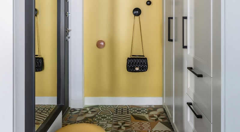 Владельцы этой квартиры были открыты к ярким цветам, что Наталья Балашова приняла как призыв к действию в интерьере действительно много цвета, и прихожая не исключение. Желтая стена здесь «переходит» на потолок, на ее фоне выделяются цветные крючки, которые являются и функциональным, и декоративным элементом. А на полу яркая плитка с рисунком в стиле пэчворк, но более современным.
