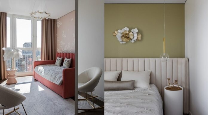 Когда сложился общий пазл из мебели и цветовое решение комнат, стало понятно, что в дизайн превосходно вписывается стиль ар-деко. Поэтому мы ненавязчиво добавили его элементы. Где-то стилизовали их в более современной интерпретации. Например, подушки и картины. Стилистика ар-деко всегда позволяет добавить изюминки, какие-то элементы декора, которые, вроде и классические, но все равно не такие как у всех. Мы не побоялись добавлять яркие акценты, использовать тропическую тематику, свойственную для ар-деко в современной интерпретации. При этом санузлы у нас выдержаны в очень минималистичном виде. Вы не увидите тут яркий мрамор и кричащий декор. Только воздушность, легкость и актуальность.