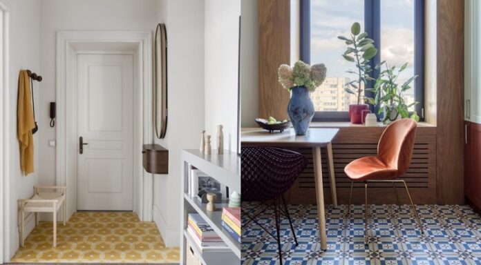 Команда студии под руководством Евгении Лыкасовой обновила эту квартиру в доме сталинской постройки в Минске. Постарались создать интерьер, намекающий на эпоху постройки дома. И это удалось получилось пространство с деликатными параллелями. В светлой прихожей сразу привлекает внимание желтая плитка с ненавязчивым геометрическим рисунком. И обратите внимание на то, как идеально эта плитка отделяет зону входа, других элементов зонирования здесь нет.