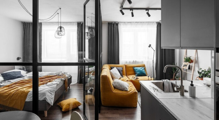 Однокомнатная квартира классической планировки с вытянутой комнатой, раздельным санузлом и компактной кухней у молодой пары была первым жильем. Чтобы выделить больше функциональных зон и сделать интерьер удобным для проживания, дизайнер решила сделать перепланировку.
