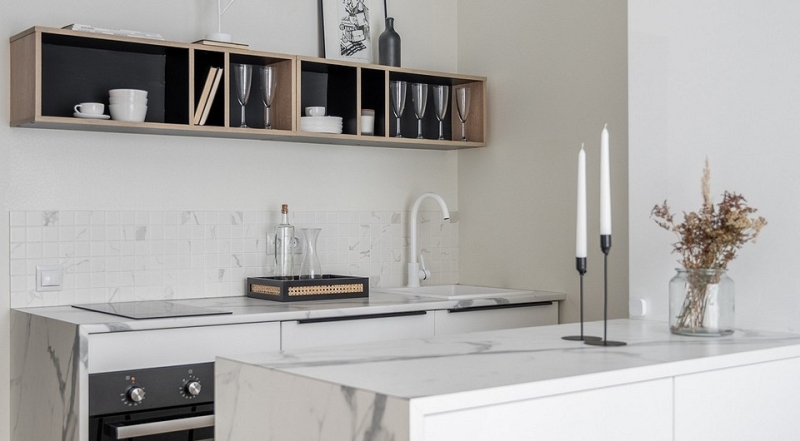 Если столешницу и верхний ярус вы проектировали с учетом роста жильцов, то размер фартука рассчитаете мгновенно. Прибавьте к получившемуся значению по 2-3 см сверху и снизу. Не во всех домах стены идеально ровные и имеют одинаковую высоту по всей длине. Да и производитель мебели может немного ошибиться с размерами. Фартук с запасом поможет решить эти проблемы.