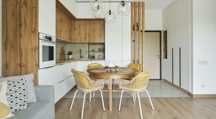 Барная стойка в данном случае выступает в роли столовой группы и разделителем между зоной готовки и залом. Она может полностью заменить классический обеденный стол, если места мало, либо стать дополнительным для завтраков или перекусов. В свободное время от приемов пищи барную стойку можно использовать как рабочую поверхность. А в основание встроить ящики или полки, если необходимо дополнительное место, чтобы хранить утварь.