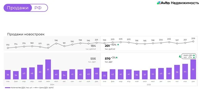 В декабре заключили 81,5 тыс. ДДУ — рекорд как за 2025 год (+71% год к году, +28% к ноябрю), так и за 2024 год. Доля ипотеки в последнем месяце года достигла максимума: 77% квартир в новостройках приобретались с использованием этого кредитного инструмента. Средний бюджет покупки квартиры в новостройке составил 9,5 млн рублей.
