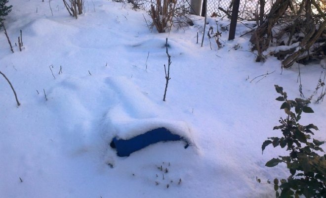 Дождавшись подходящей (не слишком морозной) погоды, постарайтесь очистить укрытие от снега. Затем приподнимите сломанные или поваленные на землю элементы конструкции, не слишком оголяя побеги. По возможности замените сломанные опоры, а те, что погнулись от веса снега, распрямите. Чтобы предотвратить повторное прогибание, поставьте внутрь укрытия крепкие опоры – ведра или деревянные чурки.