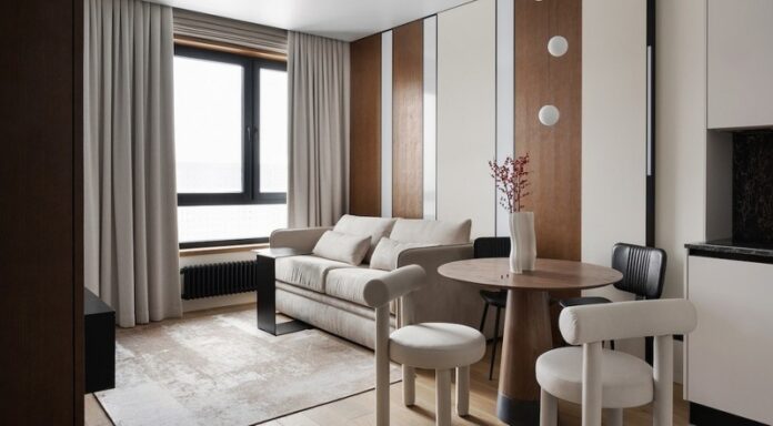 Эта маленькая квартира находится в московском жилом квартале, и заказчиком выступил мужчина, который хотел обустроить интерьер для мамы своей жены. Для этого он обратился к дизайнерам студии Spacetime Анне Сурковой и Илье Мишину.