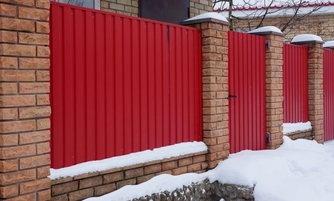 Во втором случае весь процесс будет идти дольше, но есть два преимущества. Во-первых, вся конструкция выглядит более интересной. Во-вторых, для ее установки не потребуется сложного оборудования и специальных навыков. Поэтому остановимся на этом варианте. Давайте рассмотрим, как построить забор из профнастила с кирпичными столбами и кирпичной нижней половиной.