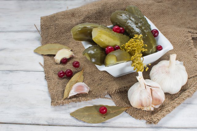 Вам понадобятся: на двухлитровую банку – 1 кг огурцов, 50 г клюквы, 3-4 дольки чеснока, 1 ст.л. соли, 2 ст.л. сахара, 4 горошины черного перца, 1 лист хрена, 3 веточки укропа, 1 л воды.