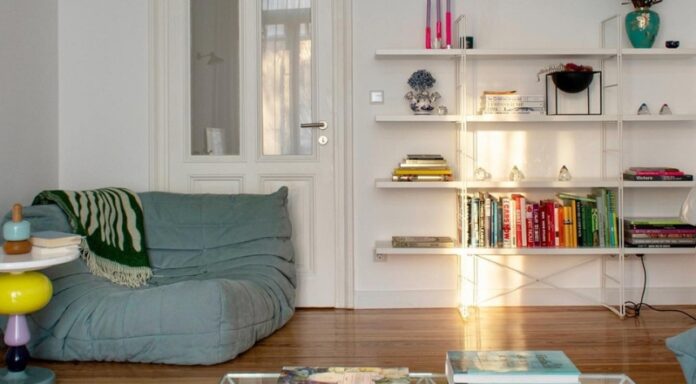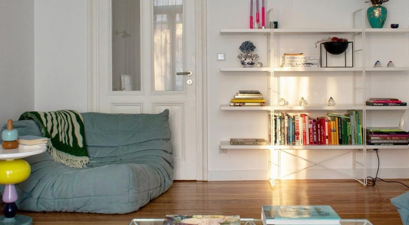 Чтобы содержимое открытых полок не перегружало интерьер и не создавало визуальный шум в комнате, старайтесь подбирать декор в тон общему оформлению пространства. Возьмите в качестве основного один из базовых цветов палитры и выстраивайте наполнение вокруг него. Это особенно актуально для интерьеров в стиле минимализм, где каждая лишняя деталь или оттенок могут серьезно сказаться на общем восприятии пространства. Например, если комната оформлена в бежевой гамме, на полках можно сложить книги, развернув их корешками внутрь, чтобы на виду оставались только светлые листы.