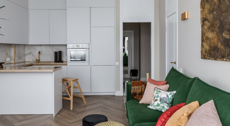 Делать ли ее акцентной или более спокойной, зависит от общей цветовой гаммы и ваших предпочтений. Чтобы кухня и гостиная были визуально связаны, цвет обивки лучше использовать и в зоне готовки. Это могут быть фасады гарнитура, подвесной светильник, обеденные стулья, акцентная стена. Так пространство будет выглядеть целостно.