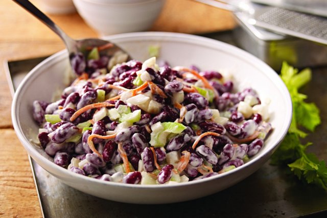 Выложите в салатник фасоль, морковь, лук и сельдерей. Добавьте заправку. Все ингредиенты перемешайте и поставьте салат в холодильник на несколько часов.